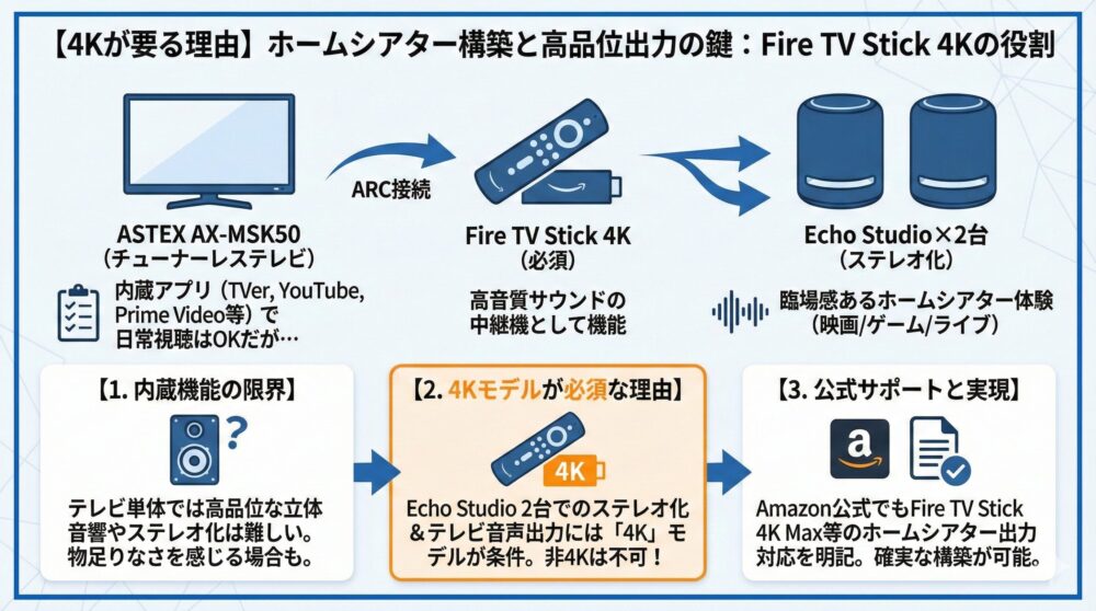 ASTEX AX-MSK50 →(ARC)→ Fire TV Stick 4K →(ホームシアター)→ Echo Studio ×2台