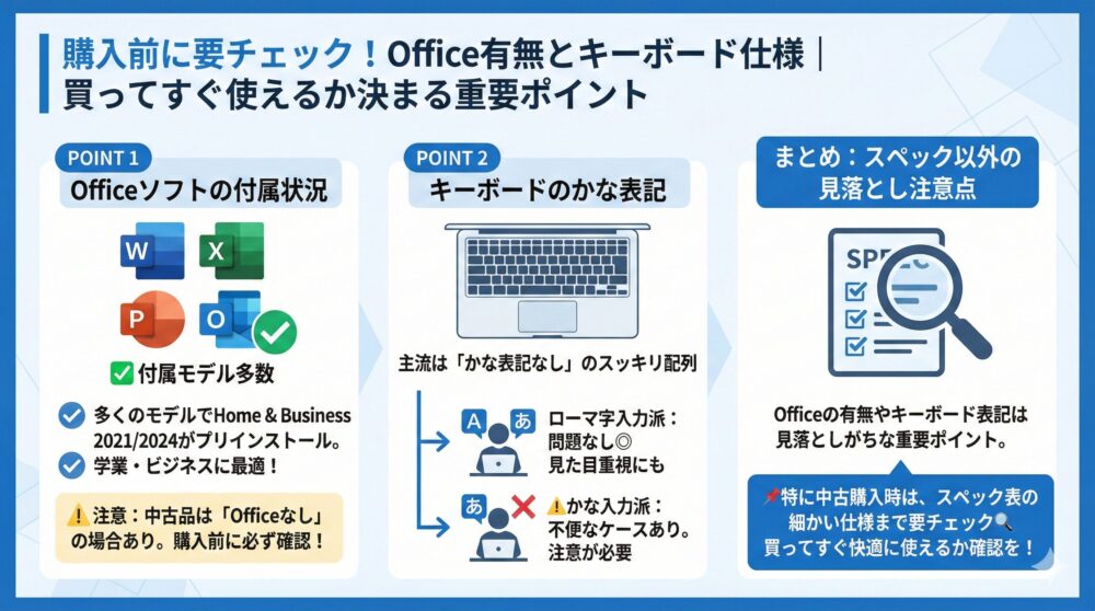 ◉ 軽さ・ポート・Officeの有無まで含めた実用性チェックが大切