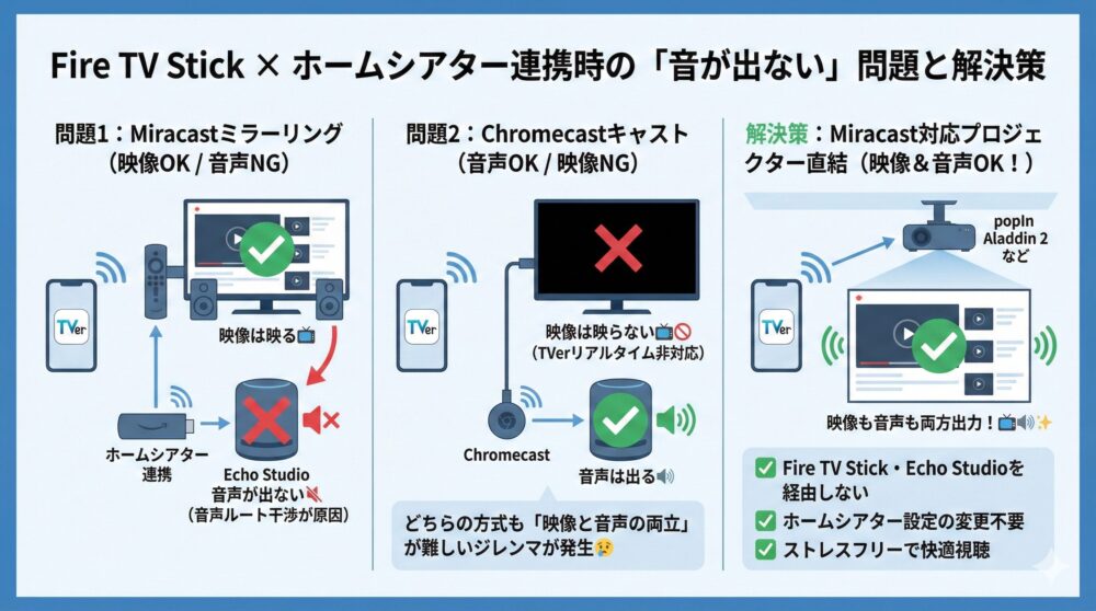 ✅ 解決策 Miracast対応プロジェクター直結で映像と音声を両立する方法