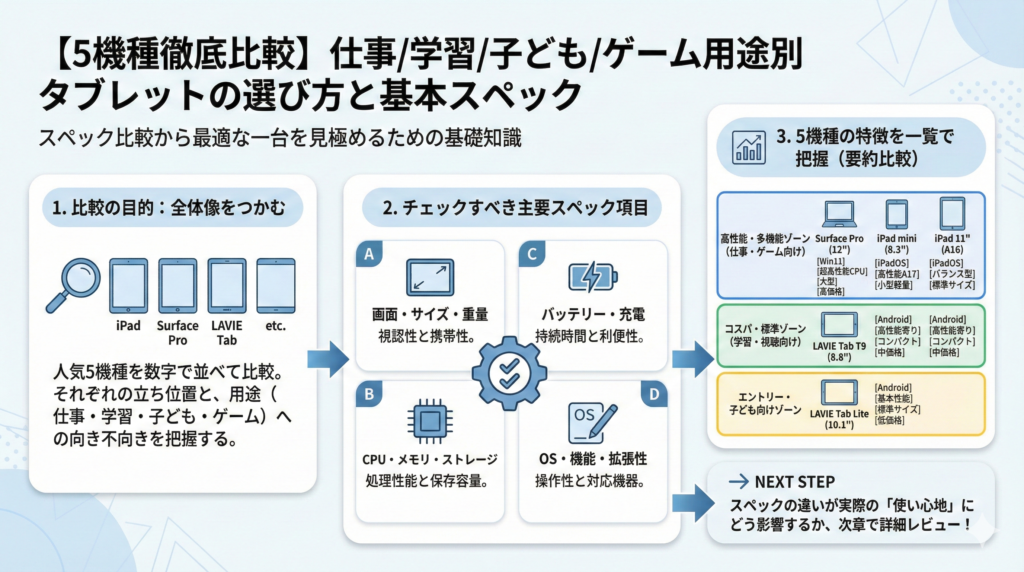 【用途別タブレット早見表】目的別に最適な5機種を一括比較してサクッと候補📊