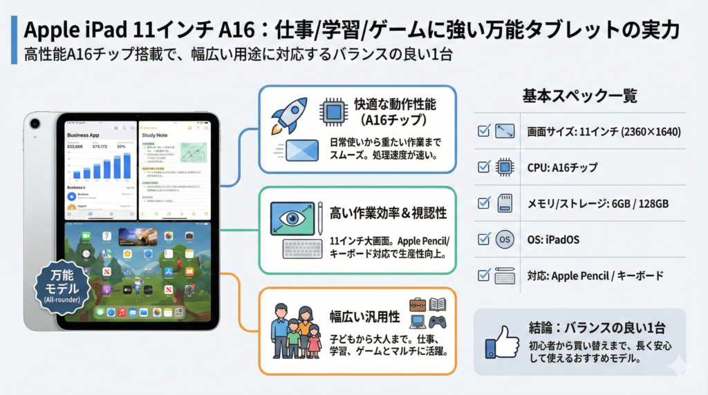 【Apple iPad 11インチ A16】仕事用/学習用/ゲーム用に向く基本スペック一覧📝