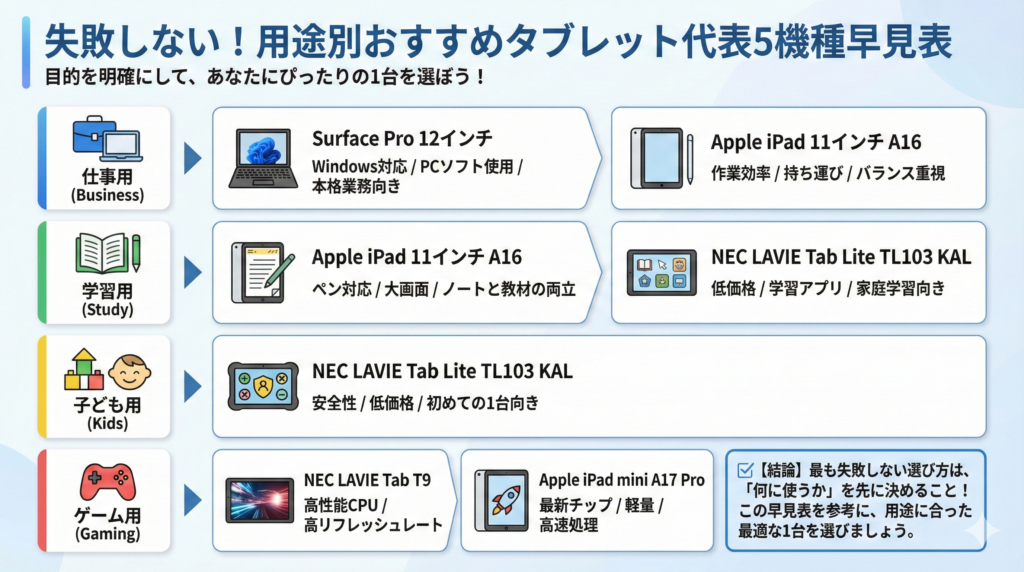 【タイプ別おすすめ早見表】仕事/学習/子ども/ゲーム用途ごとの最適タブレット✅