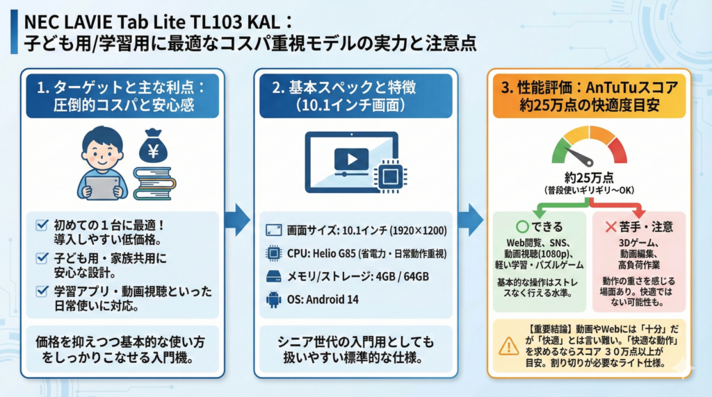 | 子ども用 | LAVIE Tab Lite TL103 KAL | 安全性/価格/初めての1台向き |