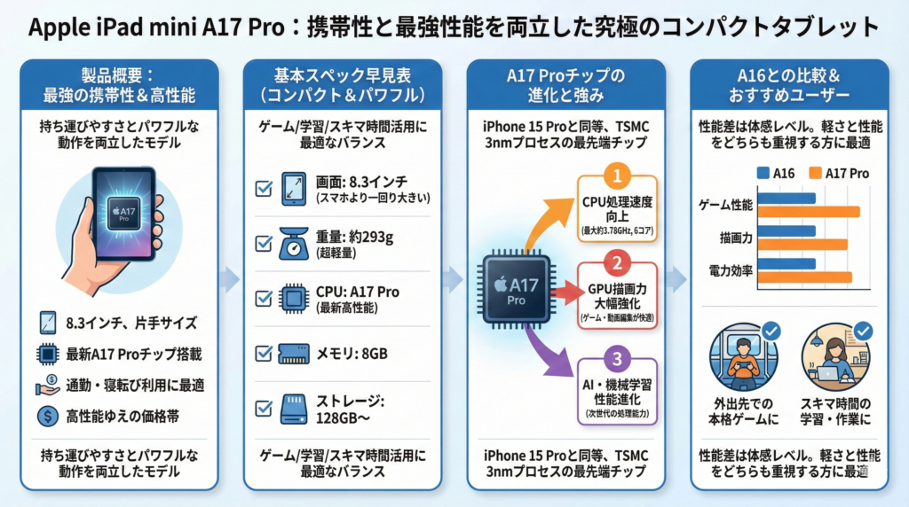 【iPad mini A17 Pro】ゲーム/学習/スキマ時間活用に最適な基本スペック早見表📋