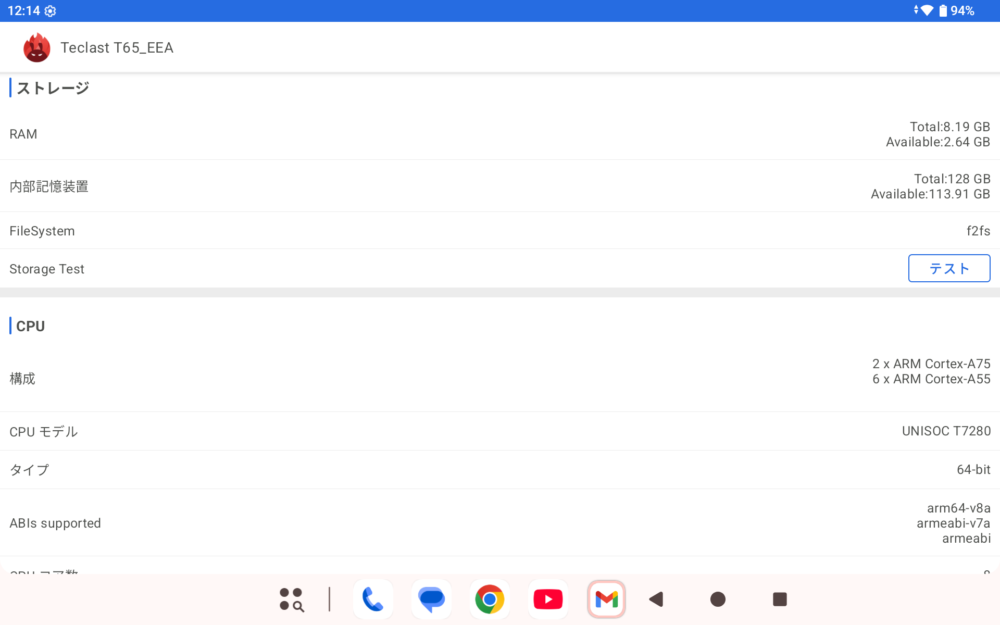 チップはUNISOC T615、RAMは4GBで、さらに仮想メモリで12GBが追加され、データ容量は128GBとなっています。
