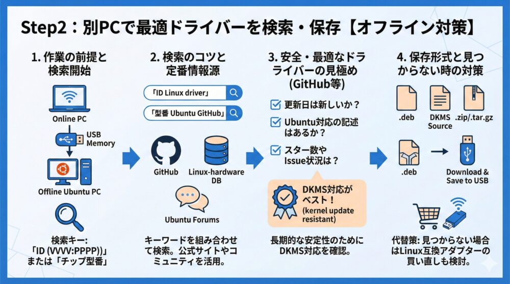 Ubuntuで非対応のWi-Fi USBアダプターをオフライン環境で使えるようにする方法を、ステップ形式で詳しく解説してきました✅